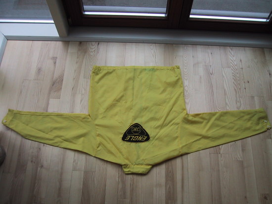 Det er en størrelse large, og den er pæn og flot. Ser næsten ud som ny, men har et meget lille falmet/bleget stykke på 1x3cm under det ene ærme. Materialet minder mest af alt om sådan noget tyndt stof man laver faldskærme af :-)