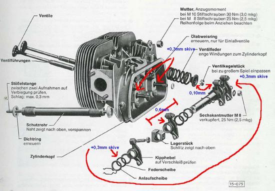 Først og fremmest har jeg fundet de største problemer ved min motor. (se billede)Den skød, havde ingen kompression og gik bare af helvedes til. Den ene ventil kunne jeg kun stille på 0,10mm da ventilerne højst sandsynlig er på vej ud af topstykket. Jeg har så sat en 0,3mm skive på hver boldt, så vippetøjet kommer det længere ud og kan nu stille dem alle på 0,15mm. M