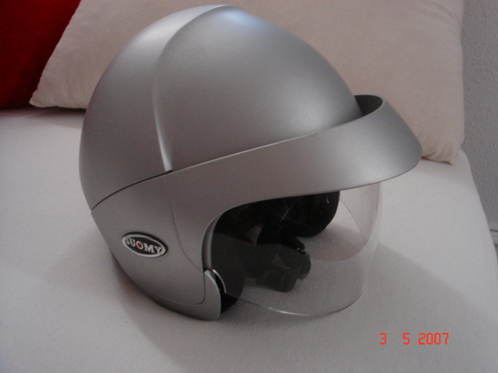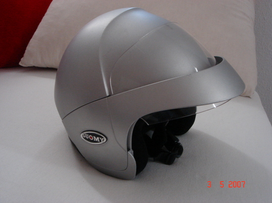 Har lige købt en knallert 45, hvor der fulgte en styrthjelm af mærket Suomy med. Hjelmen har visir og er str. Xl (ca. 60 cm)