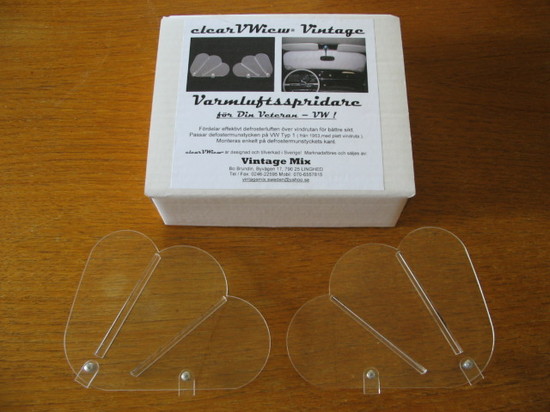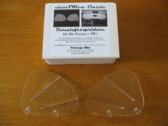 Hej alla VW-vänner ! Från en VW entusiast i Sverige kommer denna annons. Jag tillverkar ( i begränsad upplaga som hobby ) och säljer ett Nostalgiskt tillbehör passande VW Typ 1 ( från 1953 med platt vindruta ): clearVWiew Varmluftsspridare. Monteras enkelt över defrostermunstyckets kant och fördelar defrosterluften effektivt över vindrutans bredd. Ett populärt och praktiskt tillbehör som såldes på 50-, 60- och 70 talen. Dessa är av min egen design och tillverkning. clearVWiew Classic ( med rundad kant ) och clearVWiew Vintage ( med vågig kant ). Tillverkade i plexiglas. Några av bilderna visar ett par monterade i min egen VW 62'a. Snygga att se på samtidigt som de fyller en funktion. Nya i originalkartong. Pris: SEK 395:- / par + frakt. Tel: Sverige +46-246-22595, Bosse.