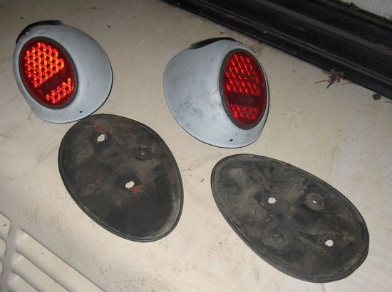 De er komplette og i god stand. Det ene Hella glas er der dog en revne i. Samt en lille bule.