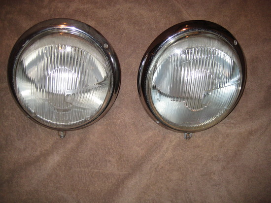 Skrå forlygter til før 1967. Rimelig pæne, incl. 4 ekstra lygteglas. Kr 400.