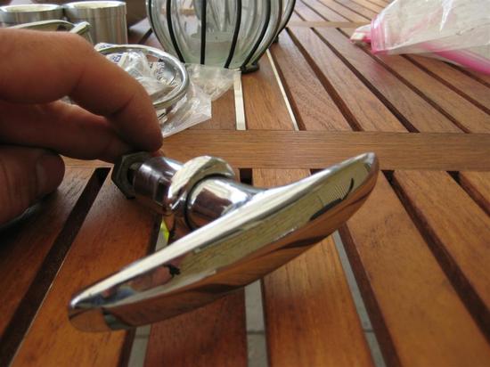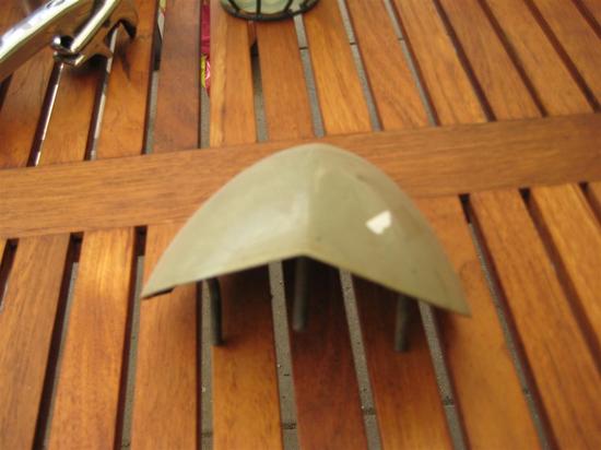 Brugt håndtag til type1 bagklap, håndtaget er med en forhøjning langs hele "ryggen" på håndtaget. Jeg har aldrig selv set denne type før, mit bedste bud er at det er til en tidlig ovaler. Pynteringen følger med. Flot stand.
