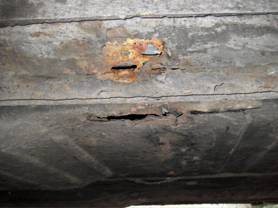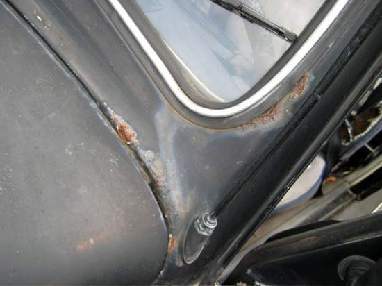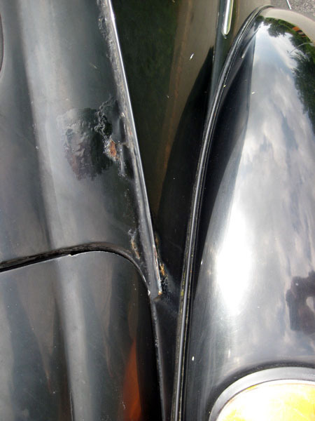 Billedet af bunden viser forrest (øverst) hullet i vangen i venstre side (fotograferet liggende på vejen), og lidt længere inde tæring ved bagsædet. Der tæringer i begge sider ved bagsædet. Og det er disse reperationer, jeg har fået tilbuds-sjus på, da de skal laves forud for syn. Hvad der ellers er at finde hist og pist, har vist primært kosmetisk betydning - men jeg er ikke fagmand, så kom hellere selv og kig. Det er dog ikke mit indtryk, at karossen skal løftes.