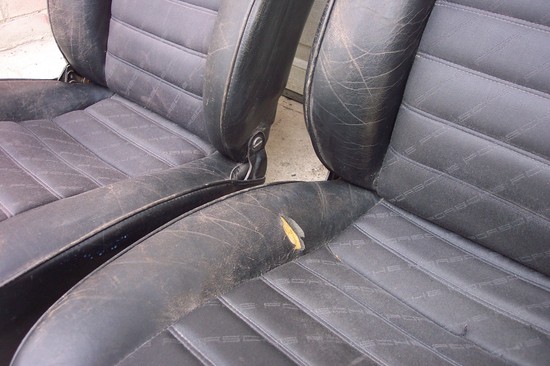 Ved total restaurering af min 911, har jeg sat et par sæder i fra en 996, og har derfor originalsæderne til overs ( billedet ). De er læderbetrukne med stof i midten. Hvor sædet påvirkes af ind og udstigning, er der slidt hul i læderet. Det trænger derfor til en ombetrækning - hvilket afspejler den lave pris.
