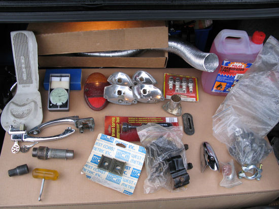 Der er tillige 7½ liter karburatorsprit og en del nye org. skiver til fastspænding af bund/karros. Det hjemmelavede værktøj er til afmontering af org. krumtaphusventilation.