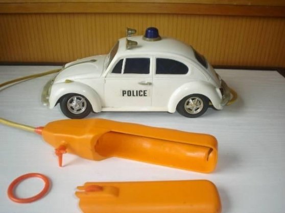 .Jeg har sådan en gammel Vw Policebil med fjernstyring til frem og bak med ledning og kabeltræk til styring af forhjul. Jeg sender lige dette Link med billeder af hvordan den ser ud...Måske nogen der ved om den har nogen værdi af betydning.